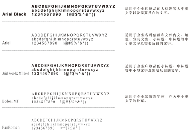 為使視覺形象更加統(tǒng)一,所有傳媒所用文字,均應(yīng)選用以下規(guī)定字體。字體允許向右傾斜20度,允許長體90%―100%,扁體110%-120%。禁止使用其他字體,特性情況(如節(jié)日、慶典)設(shè)計(jì)例外。同時(shí),為求得運(yùn)用方便,在刊物,媒體及封面的排版上,若無相同字體時(shí),可選擇字形相近的字體替代使用。